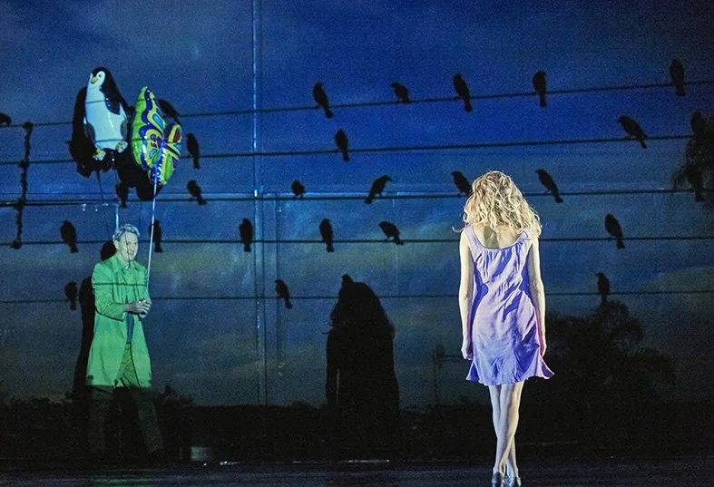 Mit dem Marschbefehl "Links, links, links", der hinter der Bühne zu hören ist. Dann öffnet sich eine der beiden hohen Wohnzimmertüren, und herein marschiert hinkend Klein Eyolf im Tarnanzug. Denn er spielt Soldat, der er einmal werden will, es aber wegen seiner Verkrüppelung nie werden wird. Er salutiert militärisch, singt "Wildgänse rauschen durch die Nacht", markiert martialisch Maschinengewehrsalven und Kanoneneinschlag, kopiert perfekt das, was so ein kleiner, allein gelassener Junge alles an Kriegsspielen im Fernsehen zu sehen bekommt. Wenige Szenen später springt er auf die viel zu hohe Bank und seiner Tante Asta auf den Schoß, weil die ihn mehr zu lieben scheint als Mutter und Vater. Der nämlich hat es sich soeben auf dem gegenüberliegenden Möbel gleichfalls bequem gemacht, auf dem Schoß seiner Frau, die er nach einer Entsagungstour durch die Berge nicht mehr als Frau, sondern als Mutter begehrt, was der, begreiflicherweise, nicht gefällt.